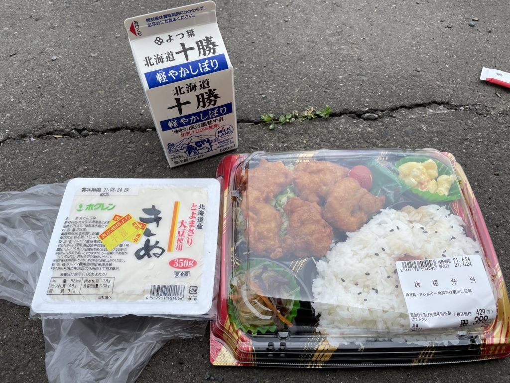 おそらくここから先はコンビニもなにもないと判断し、ここで昼飯を食べることにした。