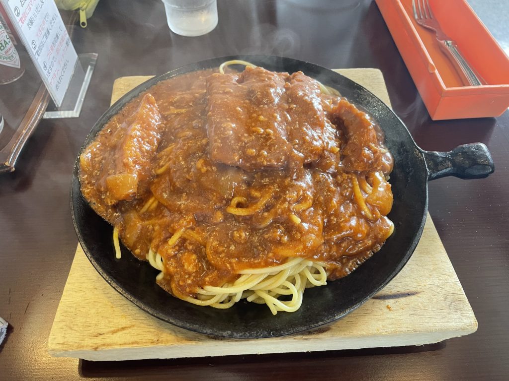めちゃくちゃ美味かった!ソースはミートソース。ほして鉄板の上に乗ってるので最後まで熱々だ。